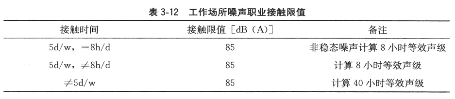 3.制定工业企业噪声卫生标准 要完全消除生产性噪声既不经济,也不可能。因此,制定合理的卫生标准,将噪声控制在一定范围之内,是防止噪声危害的重要措施之一。我国《工作场所有害因素职业接触限值 第2部分:物理因素》(GBZ2.2-2007)规定,每周工作5天,每天工作8小时,稳态噪声限值85 dB(A),非稳态噪声等效声级的限值为85dB(A);每周工作5天,每天工作时间不等于8小时,需计算8 h等效声级,限值为85 dB(A);每周工作不是5天,需计算40小时等效声级,限值为85 dB(A),见表3-12。