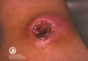 1.皮肤型 最常见,约占炭疽病例的95%。病变多见于面、颈、肩、手和脚等裸露部位皮肤。其一般发病过程:起初皮肤出现丘疹或斑疹。第2天形成水疱,周围组织水肿。至第3~4天病灶中心出血坏死,周围可见成群小水泡,水肿范围不断扩展。第5至7天坏死灶形成小溃疡,血性分泌物干涸结成黑痂,痂下有肉芽组织形成。黑痂坏死区直径约1~150px不等。水肿区直径则可达5~500px。皮肤炭疽最显著的特点是病灶坚实、无明显疼痛、不化脓。大约在水肿消退后1~2周内,黑痂自行脱落,再经1~2周愈合形成瘢痕。起病1~2天后体温升高,伴有头痛、局部淋巴结及脾大。少数病例眼睑、颈、大腿等组织较疏松的部位可出现大面积水肿而无黑痂形成(即恶性水肿型)。患处透明而坚韧,水肿迅速向周围组织扩展,全身毒血症明显,病情危重,治疗不及时可因循环衰竭而死亡。