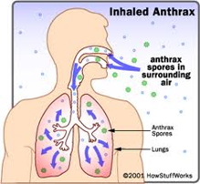 2.肺型 吸人炭疽芽胞杆菌芽胞所致。多为原发性,也可继发于皮肤炭疽。经2~4天低热、干咳、身痛、乏力等类流感症状后,症状加重,突起寒战、高热、气急、呼吸困难、咳血样痰、胸痛。体检可见喘鸣、发绀或颈、胸部皮下水肿、肺内散在湿哆音或胸膜斑体征。胸部X射线检查可见纵隔增宽、胸腔积液形成或肺炎改变。
