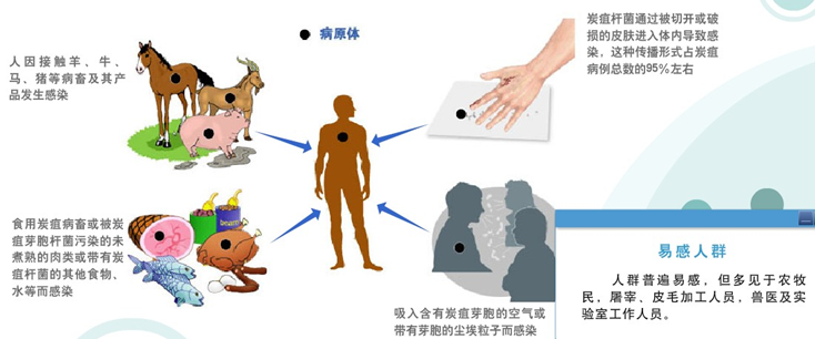 1.传染源 炭疽芽胞杆菌最易感染绵羊、牛、马、山羊等食草动物,其传染源主要是病人、病畜及其尸体和携带炭疽芽胞杆菌的食草动物。