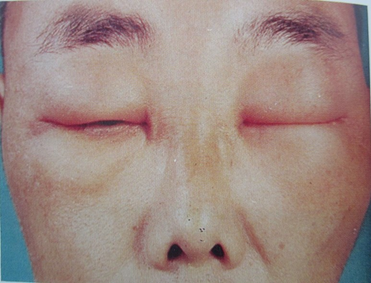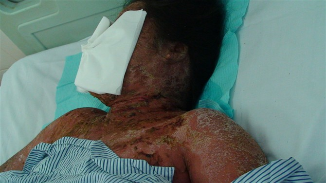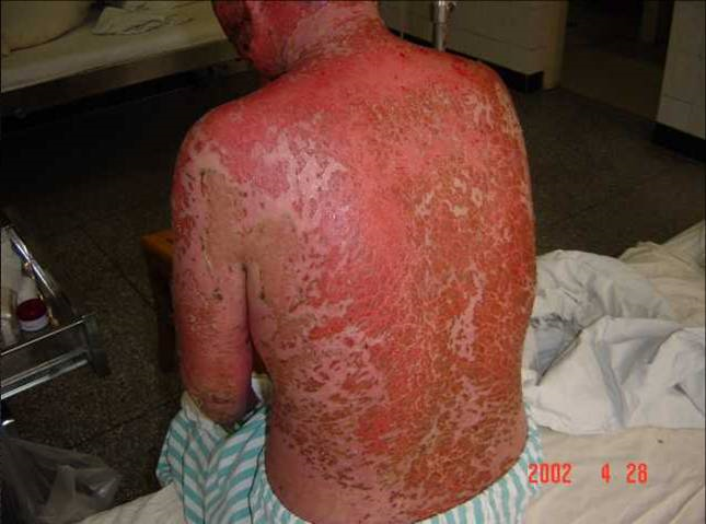 (4)大疱性表皮坏死松解症型:发病急,高热,皮疹常为全身对称泛发,l~4天遍布全身;开始为鲜红或紫红色斑片,很快融合成棕色大片,黏膜亦不例外;皮疹上很快出现巨形松弛性大疱,可发展成广泛的表皮松解,尼氏征阳性,眼、鼻、口腔黏膜亦可剥脱;内脏可同时严重受累。