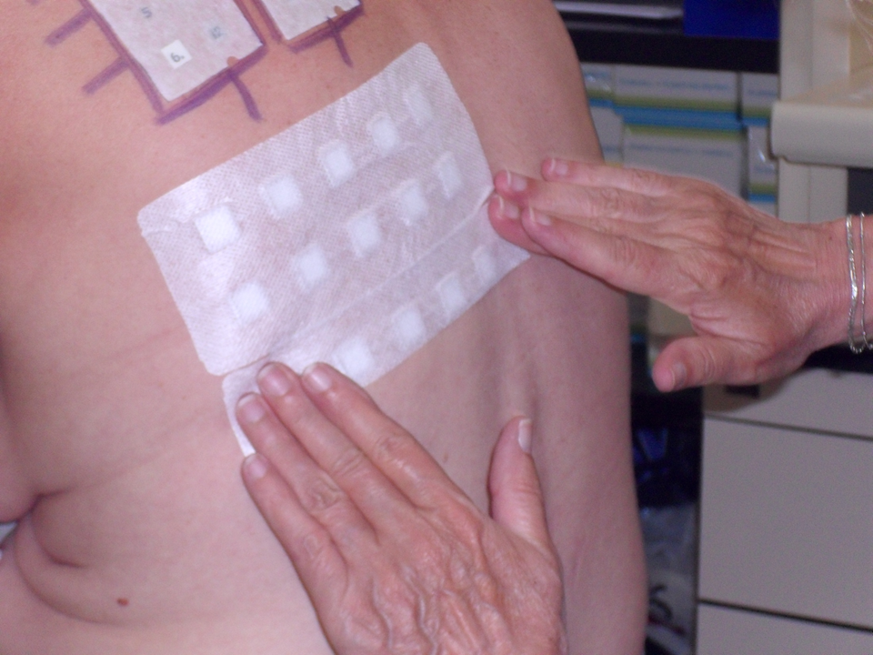 2)操作步骤:①将斑试胶带隔离纸剥除,药室朝上置于试验台上。②试验物如为固体或半固体可直接加人药室内,加人量略超过药室容积的一半(约0.02g);液体被试物可将滤纸浸湿(约0.02m1)放人药室内。③立即将置有变应原的斑试胶带从下部开始纵向贴于脊柱两侧的正常皮肤上,同时逐个轻压药室以驱除空气,并使试验物均匀分布。④试验部位做好标记,以便观察。