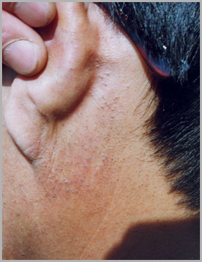 损害有两类:一类是黑头粉刺,皮疹初起时表现为皮肤干燥,毛孔显著扩张,中央嵌一小黑点,毳毛沿毛囊口折断,有的类似毛孔苔藓或角化痤疮样损害,高出皮面,抚之有刺感。损害常密集成群而不融合,进一步发展则毛囊口被角化性黑色脂质栓塞形成较大的黑头粉刺,挤出黑头脂质栓塞物后常留有特殊形态的“压模样”凹陷性瘢痕;另一类丘疹性损害及毛囊炎,前者表现粟粒到绿豆大小暗红色丘疹,中等硬度,不化脓;后者有明显的炎症现象,基底潮红、浸润明显,可发展为脓疱及囊肿,分布散在或密集,常反复发生,愈后遗留瘢痕。