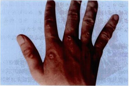 溃疡发生于四肢远端,如腕部、手指、足背、踝部等暴露部位,特别好发于关节附近。一般呈圆形,起初为表浅,随后逐渐溃烂加深,周围组织增生,隆起呈堤状,中央为凹陷的干净的溃疡面。数量不定,可单发或多发,外观呈特殊的“鸟眼状”溃疡。疼痛症状不明显,很难治愈。