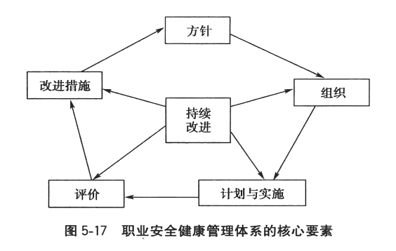 职业安全事故与自然灾害不同,原则上都是可以预防的,人们应树立“零事故”意识,立足于防患于未然。目前,我国正在鼓励企业建立职业安全健康管理体系,健全企业职业健康管理的自我约束机制,做到标本兼治,综合治理,把职业安全生产工作引入法制化、规范化轨道。职业安全健康管理体系包括方针、组织、计划与实施、评价和改进措施五大要素,如图5-17所示。