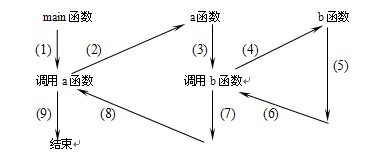 在上图中,main函数调用了函数a,而函数a又调用了函数b,所以main函数相当于间接调用了b函数,这样就出现了函数的嵌套调用。在上图中,括号中的数字顺序也就是程序的执行流程顺序。