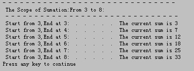 设计一个全部变量sum,分别用来存放3、4的累加和,3、4、5的累加和,3、4、5、6的累加和,3、4、5、6、7的累加和,求和功能通过函数total来完成,在主函数中循环调用该函数,输出每步累加和的结果,循环变量初值和终值通过对全局变量a、b初始化进行设置。另外设计一个函数display_scope完成表头输出效果。