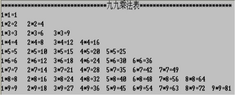 九九乘法表呈三角形,共9行。第一行有1列,第2行有两列,每行式子的个数和行号相符。在这种行号和列号都在变化的情况,要用到循环的嵌套,外层循环控制行数,内层循环控制列数(因为列的变化比行快)。