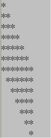 设最大宽度值为width,根据图案的规律,输出的总行数为width+width-1,图案应分两部分考虑 ,上半部分有width行,*号个数随行数在递增;下半部分有width-1行,每行分成左右两个部分,左边空格个数在递增,右边*号个数随行数在递减。对于整个图形要用循环控制行数,对于每一行要分别用循环控制空格的列数和*号的列数,所以,用循环的嵌套形式来实现。