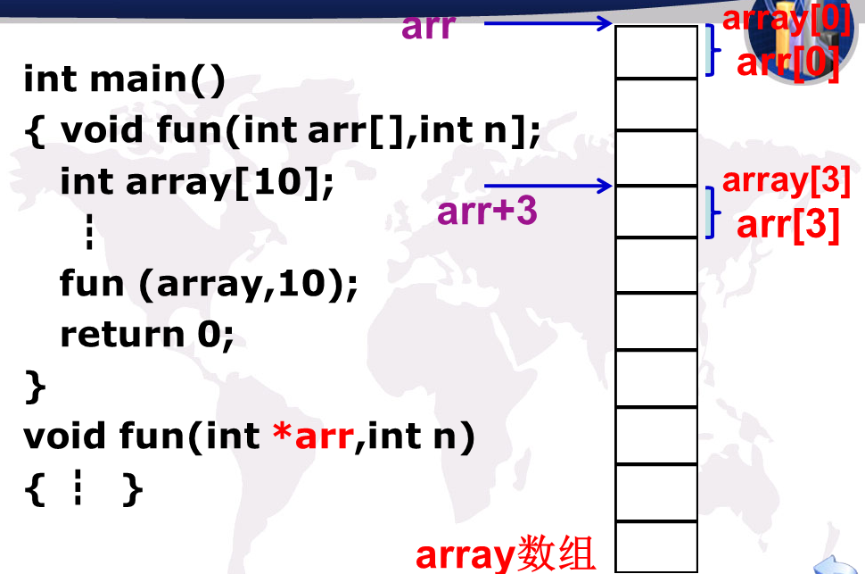 void fun(int arr[ ],int n) // 相当于:void fun(int *arr,int n)