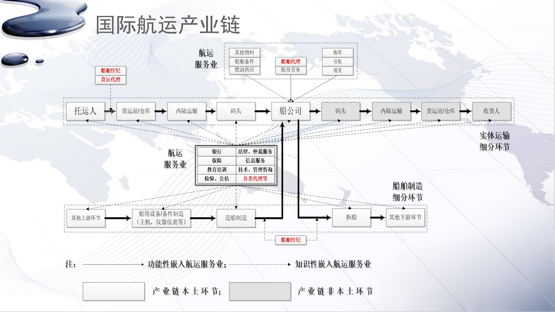 航运代理是指代理人代表船舶所有人或船舶经营者或承租人或货主从事运输服务,提供的服务包括:谈判和完成船舶的买卖;谈判和监督船舶的租赁;在适当的和相关财务的事务方面,收取运费或租金;安排报关和货物的单证以及安排运送货物;取得、处理单证,履行关于发送货物所有活动;组织船舶的到达和离开安排;安排船舶在港的供应。(联合国贸易与发展会议(UNCTAD)1988年制定的《航运代理最低标准》)