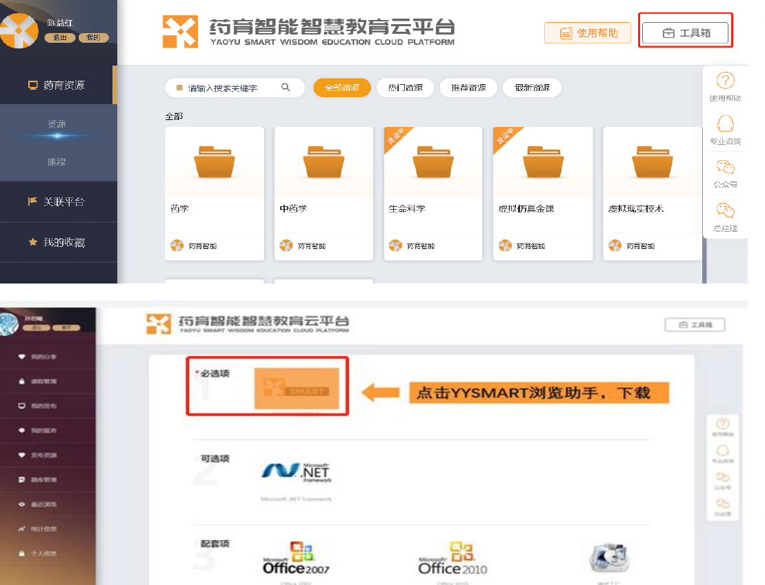 进入界面后,点击右上角工具 箱 再 点击 必选项 yysmart 浏览助手,进行下载。