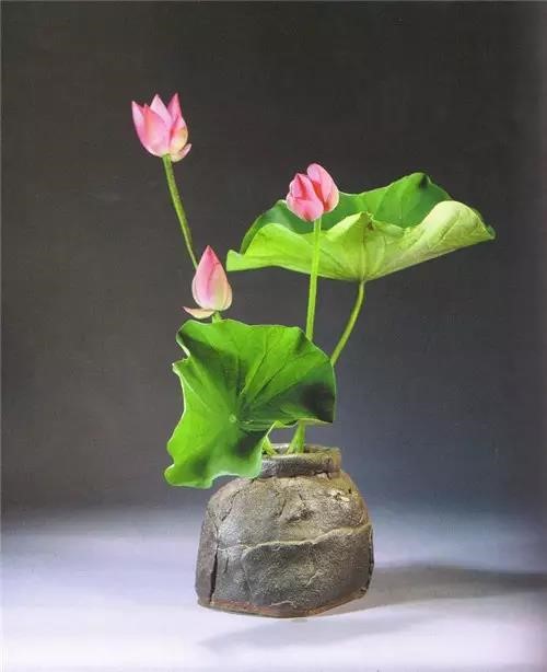 c、花艺作品的构图特点的解读,注意表达各荷花花朵、荷叶枝及枝叶的对比、统一、均衡和韵律感