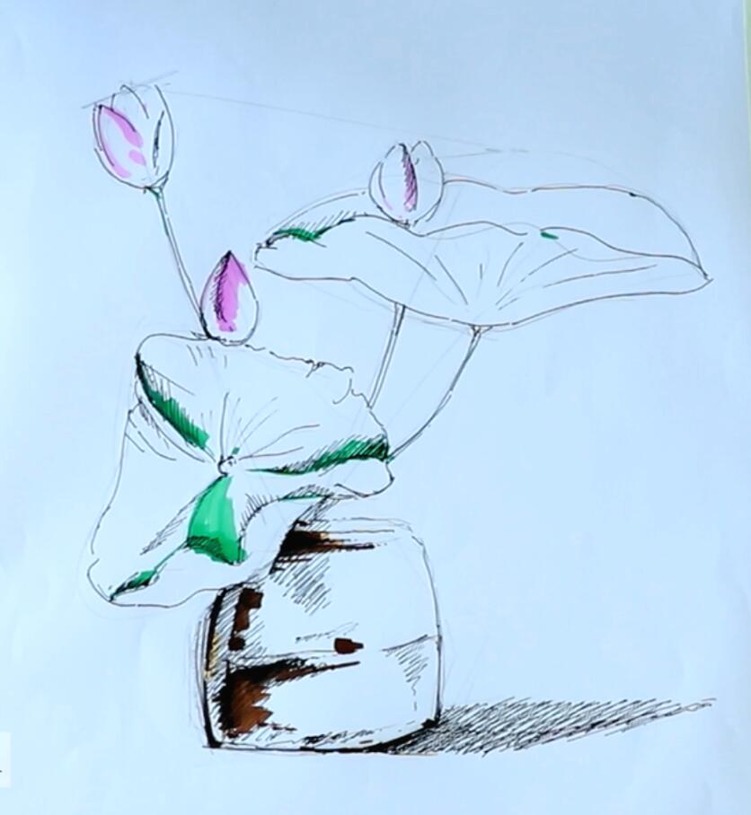 a、花艺素材(莲花花朵)的透视关系,注意各枝花朵大小关系,近大远小,注意把握虚实关系;