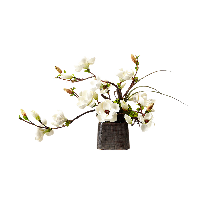 (2)固定:为了让花卉姿态按照你的设想进行,一般在花器的瓶口处,按照瓶口直径长度,取两段较粗枝干,十字交叉于瓶口处进行固定。专业插花,还要采用花插、花泥、铝丝等工具进行固定。