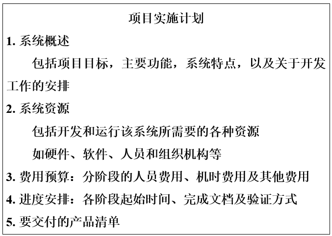 分析员应该为所推荐的方案草拟一份开发计划,制定工程进度表、估计对各类开发人员和各种资源的需要情况、估计系统生命周期每个阶段的成本、给出下一个阶段(需求分析)的详细进度表和成本估计。