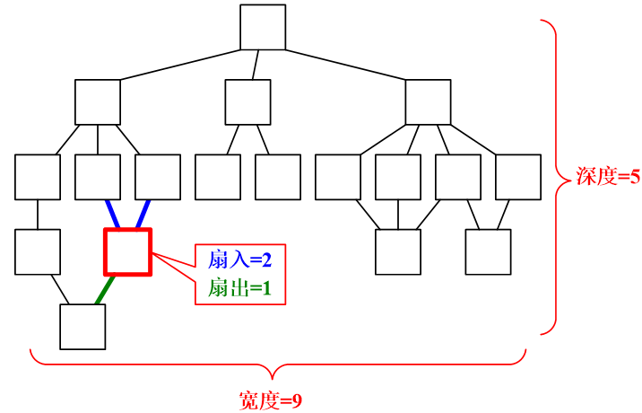深度:软件结构中控制的层数,它往往能粗略地标志一个系统的大小和复杂程度。