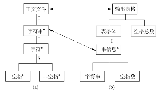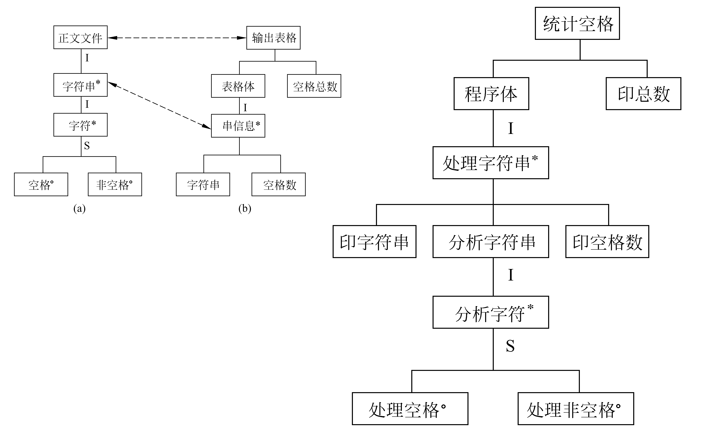 (2) 找出输入数据结构和输出数据结构中有对应关系的数据单元。所谓有对应关系是指有直接的因果关系,在程序中可以同时处理的数据单元(对于重复出现的数据单元必须重复的次序和次数都相同才可能有对应关系)。