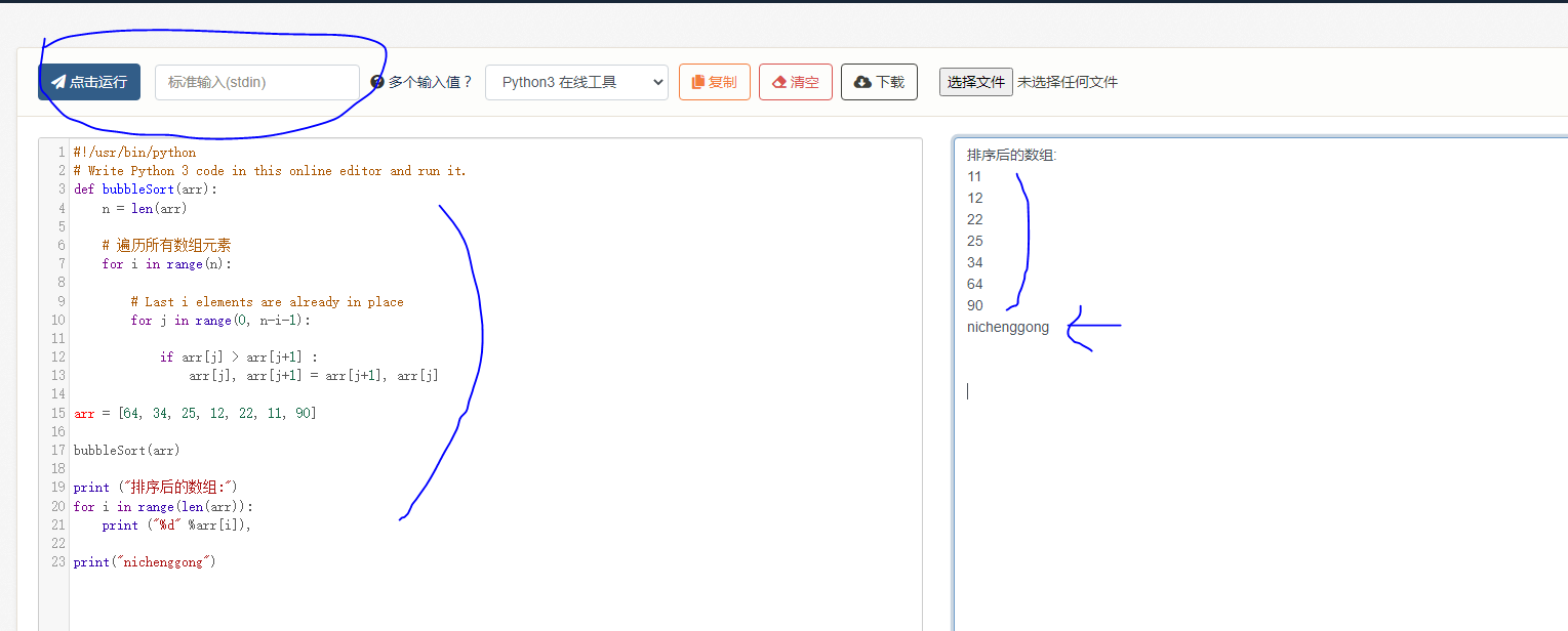 三、 1. 请你使用浏览器打开一个python在线编译器。2. 取自行找一个排序算法(冒泡排序。。。。)。3. 在python在线编译器上,运行上面排序代码(最后一行,输出你自己的姓名)