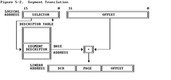 [1] 分段地址转换:CPU把逻辑地址(由段选择子selector和段偏移offset组成)中的段选择子的内容作为段描述符表的索引,找到表中对应的段描述符,然后把段描述符中保存的段基址加上段偏移值,形成线性地址(Linear Address)。如果不启动分页存储管理机制,则线性地址等于物理地址。[2] 分页地址转换,这一步中把线性地址转换为物理地址。(注意:这一步是可选的,由操作系统决定是否需要。在后续试验中会涉及。
