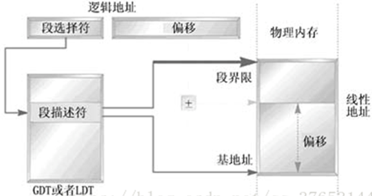 正是由于以上概念的提出,使得“段地址:段内偏移地址”的访问策略从实模式下对物理地址的直接映射变成了保护模式下对GDT或LDT的间接映射(如下图所示),进程在访问内存段(无论是数据段还是代码段)前都需要通过特权级检查。段属性的加入让用户程序对内存的访问不再“为所欲为”。