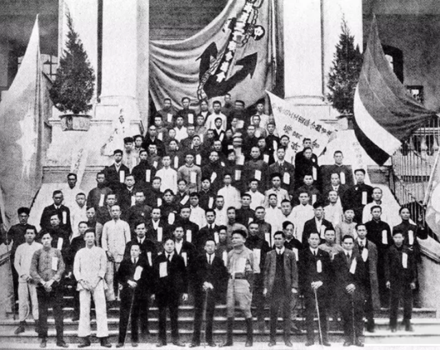 1922年1月12日,在第三次向资方提出增加工资等三项要求被无理拒绝后,苏兆征、林伟民组织领导中华海员工业联合总会举行了香港海员大罢工。在中国共产党的指导下,罢工坚持了56天,最终取得了增加工资、承认工会的胜利。图为香港海员罢工胜利后,罢工主要领导人苏兆征(前排右三)、林伟民(前排右二)和香港海员工会成员欢庆胜利。