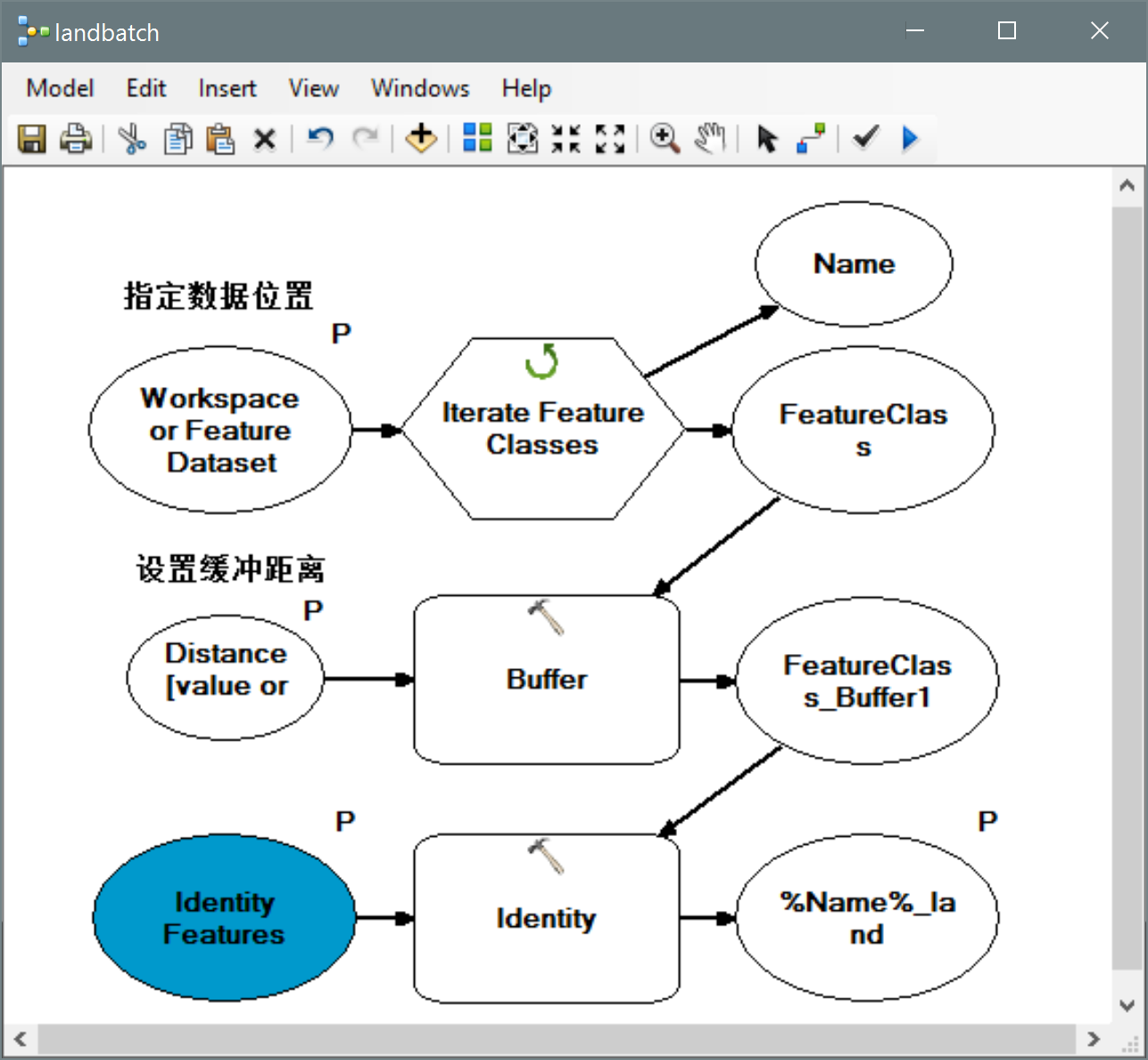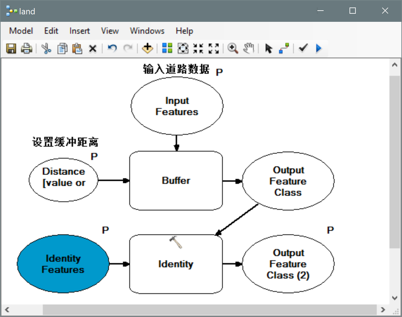 在ArcGIS中,模型构建器(Model Builder)是构造地理处理工作流程和脚本的图形化建模工具,主要由输入数据、输出数据、空间处理工具以及它们之间的连接关系四个部分组成。