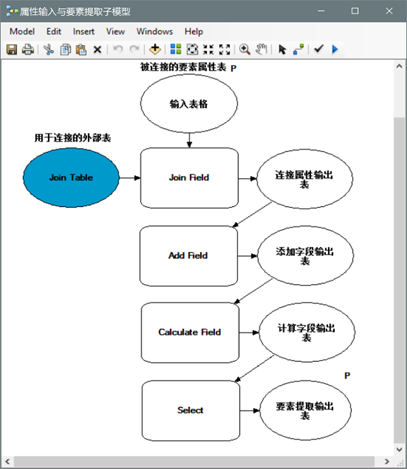 下图是一个图解模型。它通过外部表格连接法输入属性,添加新字段并计算该字段,并选择其中符合要求的要素。