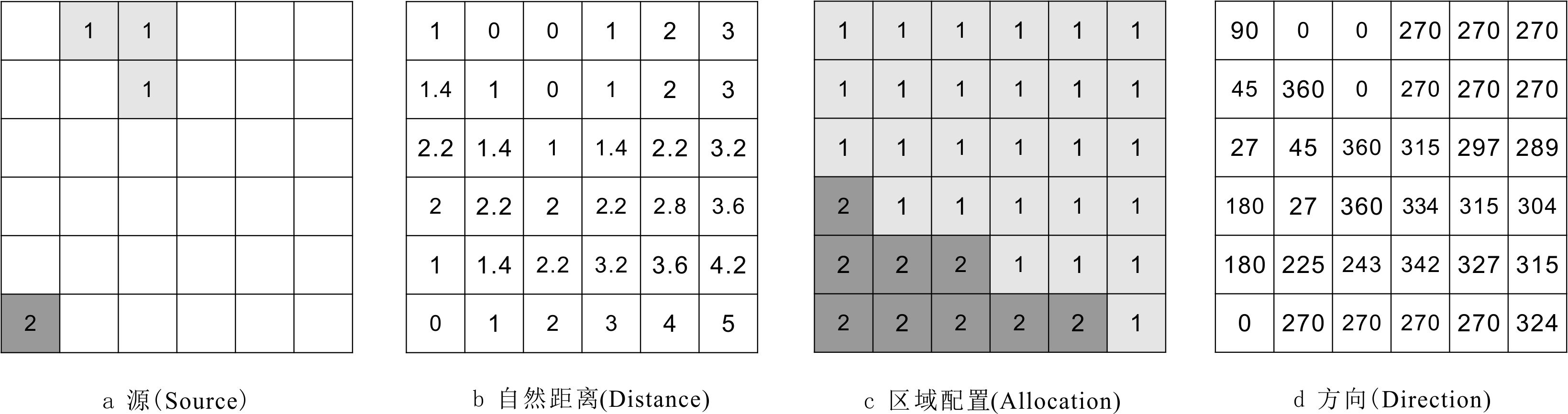 方向栅格中的像元值为该像元至最近源的方向。方向值常以度为单位,以正北为起点顺时针从0°至360°。