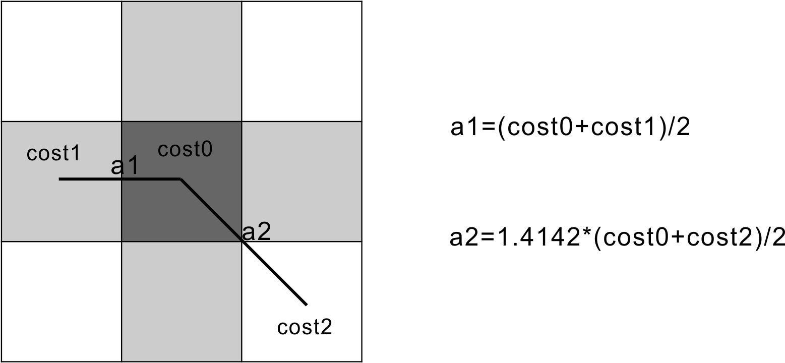 累计成本必须考虑相邻像元之间的连接路径。横向或纵向连接的相邻2个像元之间的成本距离为它们成本的平均值;斜向连接的相邻像元间的成本距离是平均成本乘以1.4142。