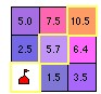 步骤2:选出上一步活动像元集中累计成本值最小(1.5)的像元,先将其值赋予输出的成本栅格数据中同位置的像元,并将它从活动像元集中剔除,再将它的相邻像元(图4.67e中粗线框里的像元5、2)补充进入活动像元集中,计算其最低累计成本(图4.67f)。