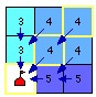 步骤1:将源像元的累计成本赋值为0,并激活与源像元相邻接的像元,组成累计成本活动像元集(图4.67c中粗线框里的像元),根据连接状况及其成本计算方法,计算每个活动像元的最低累计成本值。