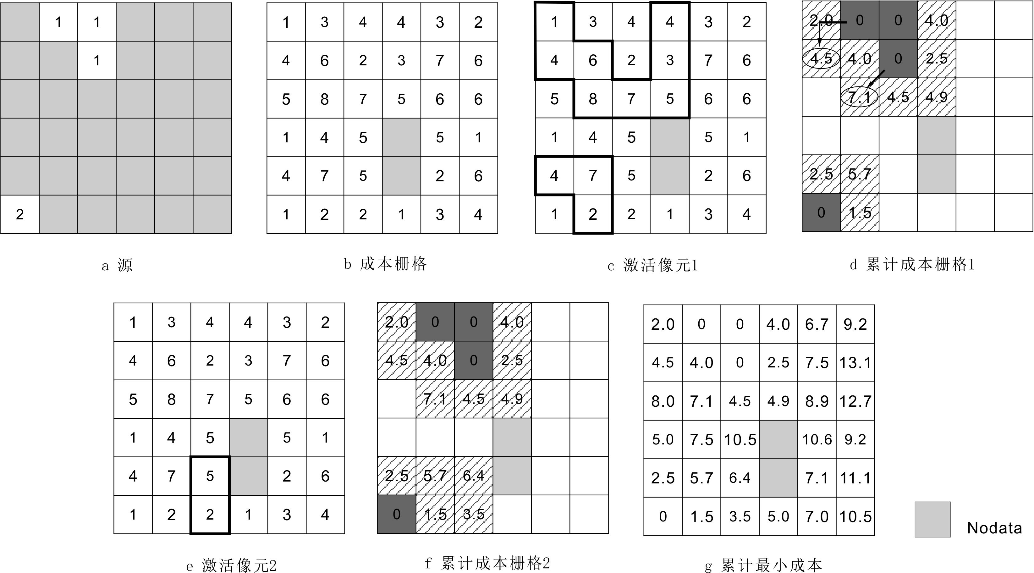 步骤3:重复第2步,不断进行循环迭代,直至所有的像元均已赋予最低累计成本值(图4.67g)。