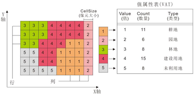 ESRI栅格数据的原生数据格式。Grid通常包括整形和浮点型两种类型的栅格。整形栅格多用于表示离散数据,浮点型栅格多用于表示连续数据。整型栅格的属性存储在它的值属性表(VAT)中,栅格中的每个唯一值对应于属性表中的一条记录,存储特定值(VALUE)和它所表示的栅格像元数量(COUNT)。