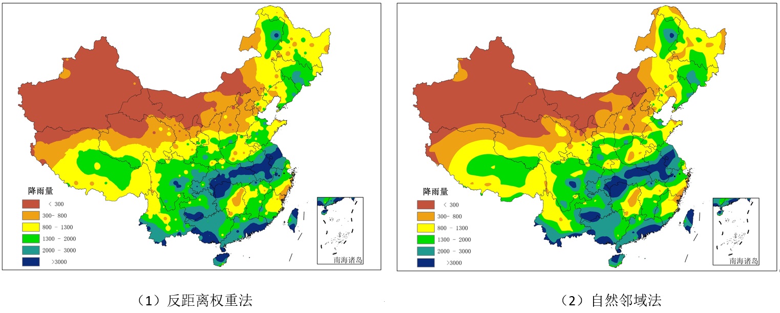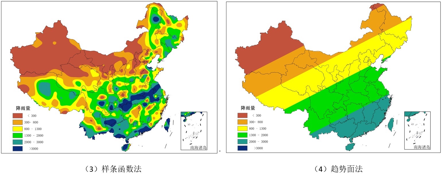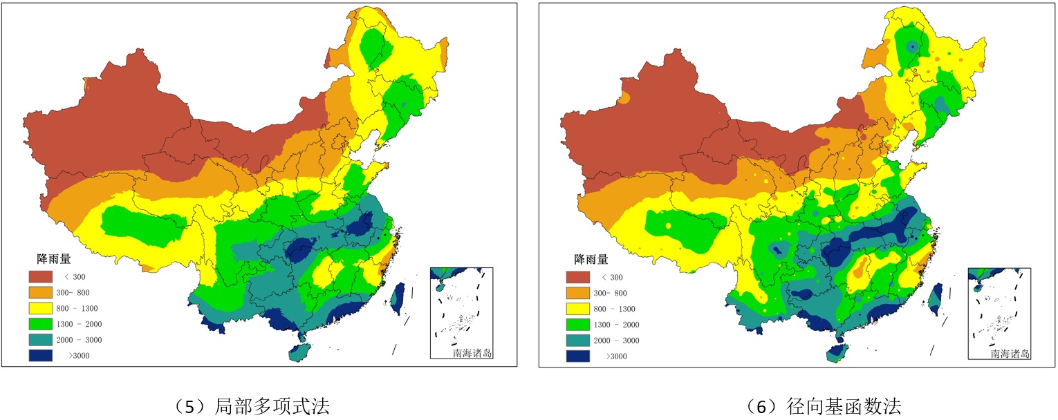 对我国某年6月685个气象站的降水观测数据,采用上述6种方法进行空间插值生成降水表面(图4.83)。