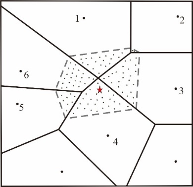 自然邻域法插值的基本过程如下(图4.78):(1)用所有已知样本点(图中的小黑点)构建泰森多边形(图中的黑色粗线);(2)用待插值点(五角星)与周边的已知样本点重新构建一个新的泰森多边形(图中的虚线);(3)将与新泰森多边形相邻的点用于插值(图中编号的6个点);(4)计算新泰森多边形在每个原泰森多边形中的面积比例(重叠比例),作为相邻样本点的权重;(5)计算相邻点的加权平均值。