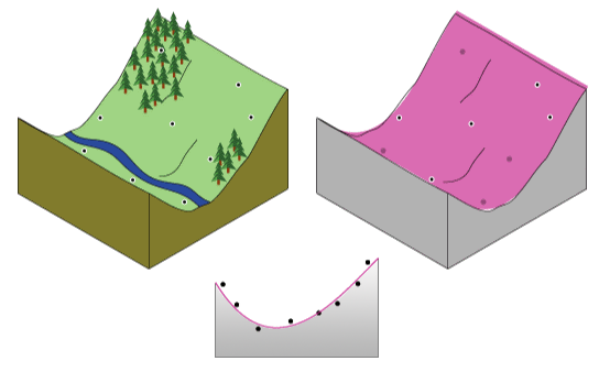 趋势面法(Trend)插值是一种全局多项式插值(Global polynomial interpolation,GPI)方法,它根据样本点的属性值和空间坐标的关系,对整个区域的样本点采用全局多项式、基于最小二乘法进行拟合,生成一个反映要素整体渐变趋势的平滑表面。在概念上,趋势法插值类似于取一张纸,将其插入各凸起点之间,实际情况下,平整的纸张是无法完全模拟包含山谷的地表,于是将纸张略微弯曲,模拟效果将会更好。平面是一个一阶多项式(线性),二阶多项式允许1次弯曲,三阶多项式允许2次弯曲,以此类推。