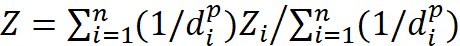 反距离权重法(InverseDistance Weighted,IDW),又称为距离反比加权法,它以待插值点与若干邻近样本之间的距离倒数为权重,采用加权平均的方式来计算待插值点的值,属于确定性的内插方法,也是一种局部拟合方法。反距离权重法基于相近相关的原理,认为距离越近的点对待插值点具有较大的影响,而距离越远的点对待插值点的影响较小(即作用的大小与距离的大小呈反比)。该方法假设各已知采样点对待插值点的预测值都有局部影响,其影响随着距离的增加而减小,离待插值点近的已知采样点在预测过程中所占的权重大于离待插值点远的已知采样点的权重。其一般公式为: