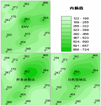 可以看出,自然邻域法插值与IDW不同的是,用于插值的相邻样本点的选择方法及权重的计算方法不同。