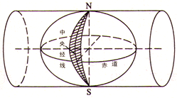 我国国家基本比例尺地形图中的大中比例尺地图(1:1万、1:2.5万、1:5万、1:10万、1:25万、1:50万),一律采用高斯-克吕格投影,即横轴等角切椭圆柱投影(图2.51)。其中1:1万比例尺的地形图采用经差3度分带,1:2.5万~1:50万采用经差6度分带。