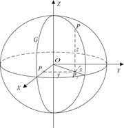 空间直角坐标系以旋转椭球体中心O为原点,以本初子午面与赤道面的交线为X轴,以赤道面上过原点与X轴垂直的方向为Y轴,以旋转椭球体的旋转轴为Z轴,构成右手直角坐标系O-XYZ。