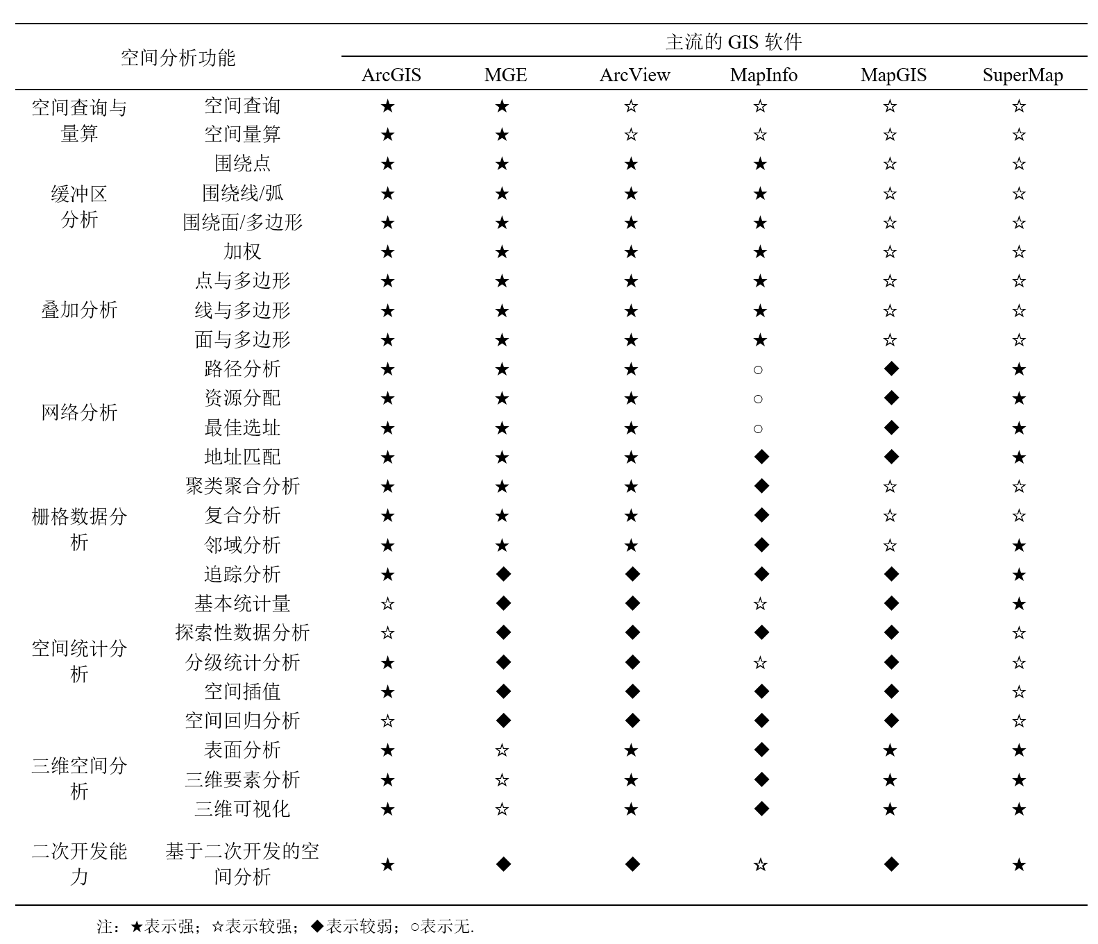 表1.1 GIS软件空间分析功能比较(张刚等,2013)