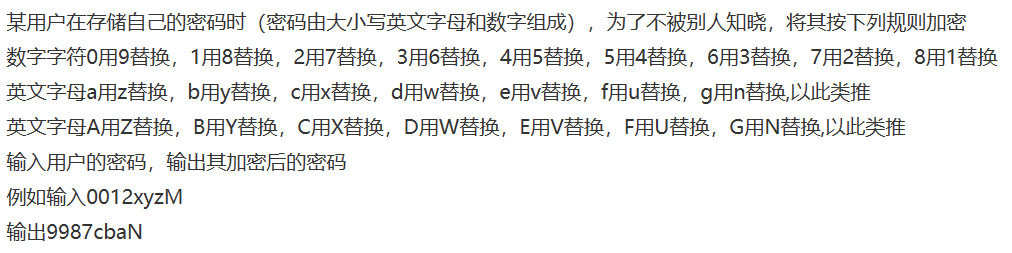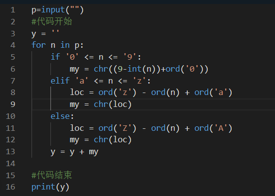 方法2:因为加密规则是两个字母位置和是25,最简单方法就是用'z'的位置-i的位置得到密文字母的位置,然后加上'a'在Unicode表中的位置,即loc = ord('z')-ord(i) + ord('a')