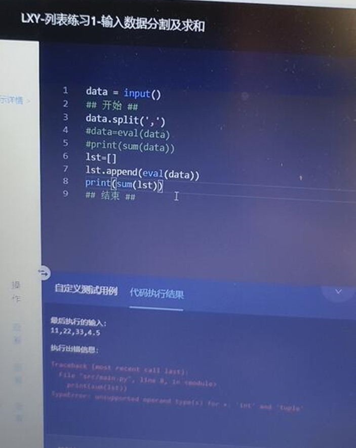 要查找错误原因,可以在spyder控制台中输入这些命令,对于输入语句,我们给定输入数据,然后每条命令发出后观察变量浏览器中的值。我把这个过程展示给你看,你可以知道在data.split(',')命令之后的结果是data已经是一个列表了,其值为['11','22','33','4.5']。这个时候就应该把列表中的每个元素转换为数字类型,可以用for循环,也可以用列表推导式实现。合起来可以这样。