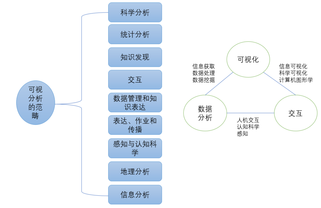 图1-12左:可视分析学涉及的学科;右:可视分析学的学科交叉组成