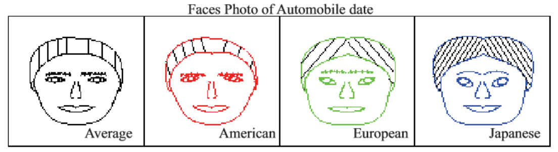 1973年HermanChernoff(赫尔曼诺夫)采用15个指标,发明了表达多维数据的脸谱编码,一个指标代表一个面部特征,这样,按照各变量的取值,根据一定的数学函数关系,就能确定脸的轮廓以及五官的部位等,每一个样本点都用都可用一张脸谱来表示。脸谱图容易给人们留下较为深刻的印象,通过对脸谱的分析,就可以直观地对多维数据进行归类或比较研究。