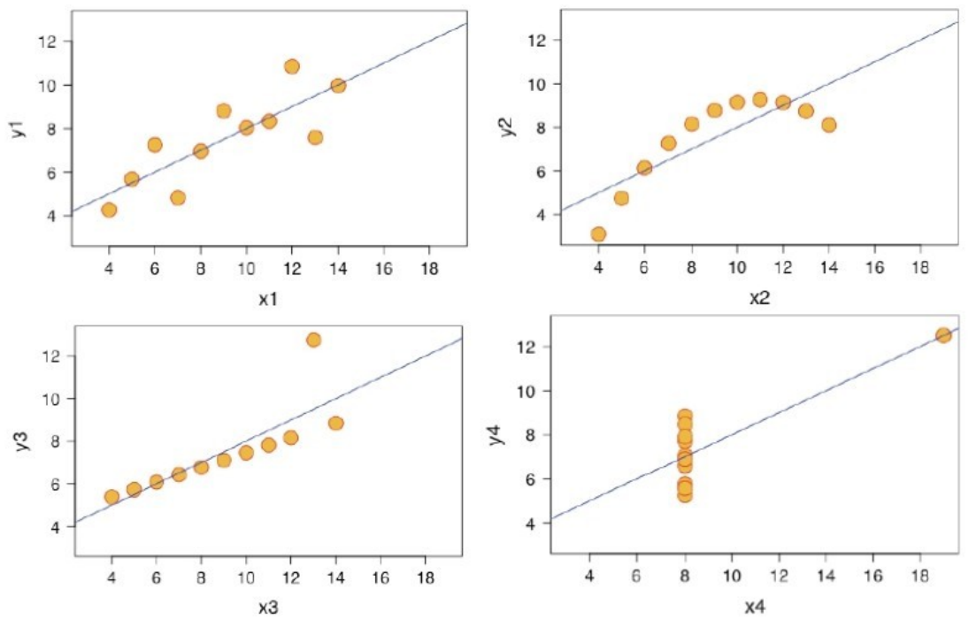 图1-1Anscombe实验(Anscombe1973)的4个二维数据点集的可视化