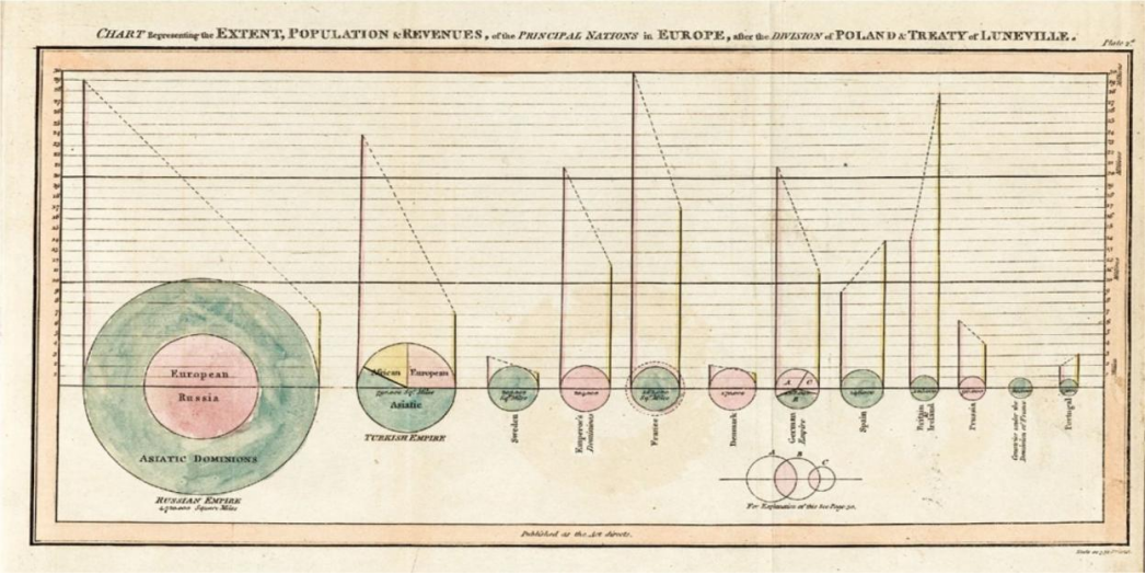 17世纪后期到18世纪,绘图家不再满足于在地图上展现几何信息,发明了新的可视化表达方法,如等值线、轮廓线等。18世纪是统计图形学的繁荣时期,折线图、柱状图、饼状图等基础图形都产生于这个时期。现代图表的发明者威廉·普莱费尔(WilliamPlayfair)发明了广泛流传的折线图和柱状图,在其著作《统计摘要》(StatisticalBreviary)中发明了饼状图,如图1-5所示: