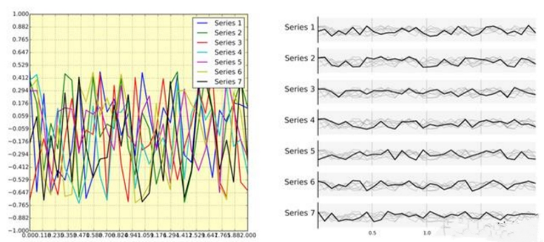 如下图所示,左面将7组数据用不同的颜色画到一张图里,有效信息都混杂到了一起,非常糟糕;而右面将7组数据用7个图分别突出显示,一目了然。