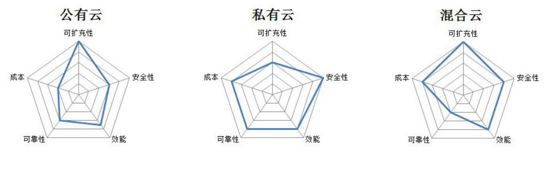 1970年以后,随着个人计算机的普及和不断发展,可视化处理的数据范围从简单统计数据扩展为更大的网络、层次、数据库、文本等非结构化与高维数据。各个领域对于数据分析和可视化提出了更高的需求,从而促使信息可视化发展成一门学科。如图1-8,利用雷达图对多维数据进行统计,比较公有云、私有云、混合云多个维度的性能值。